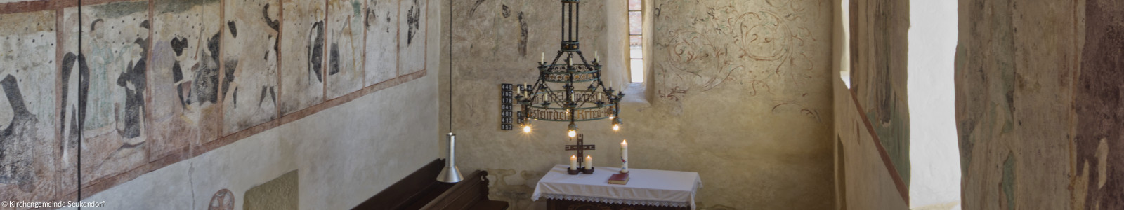 Neben unserer Kirche in Seukendorf haben wir noch die kleine Kapelle in Seckendorf. Sie wurde im 14./15. Jahrhundert gebaut. In ihrem Inneren ist sie mit zahlreichen Fresken ausgeschmückt. Jeden letzten Sonntag im Monat feiern wir hier Gottesdienst.